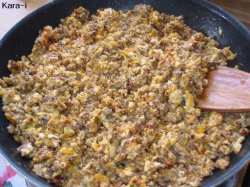 Hackfleisch (Pashan) fertig ist, fügt man zwei oder drei Eier hinzu und