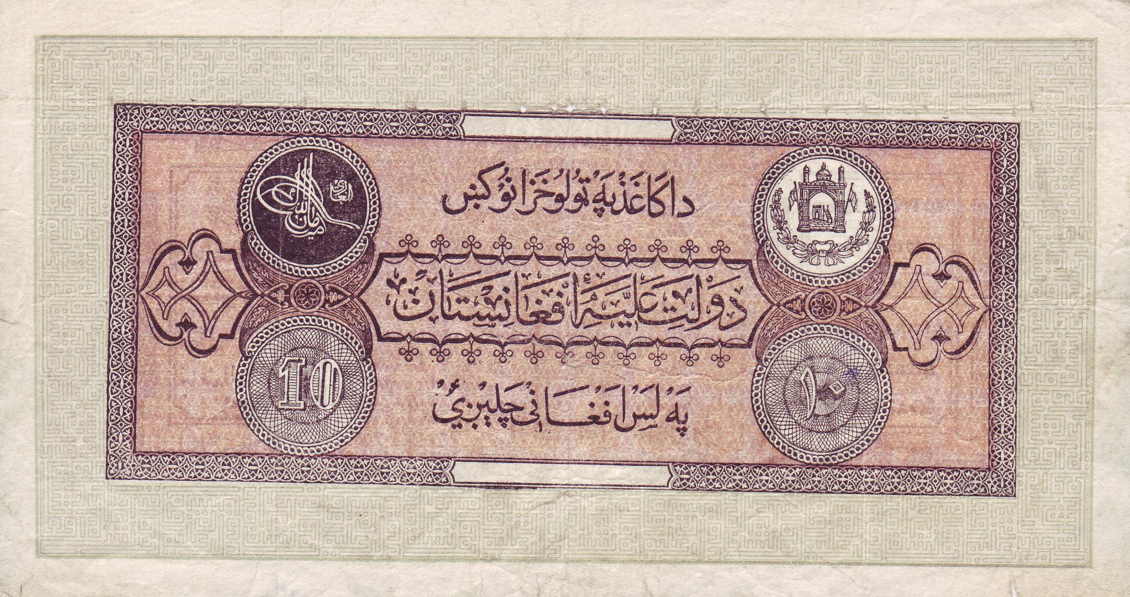 ![]() 10 Afghani (Rückseiteeite) Motiv: 1. Staatswappen und Königssiegel Afghanistans |