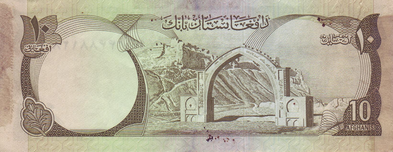![]() 10 Afghani (Rückseiteeite) Motiv: Bost-Triumpfbogen, Lashkargah, Helmand |