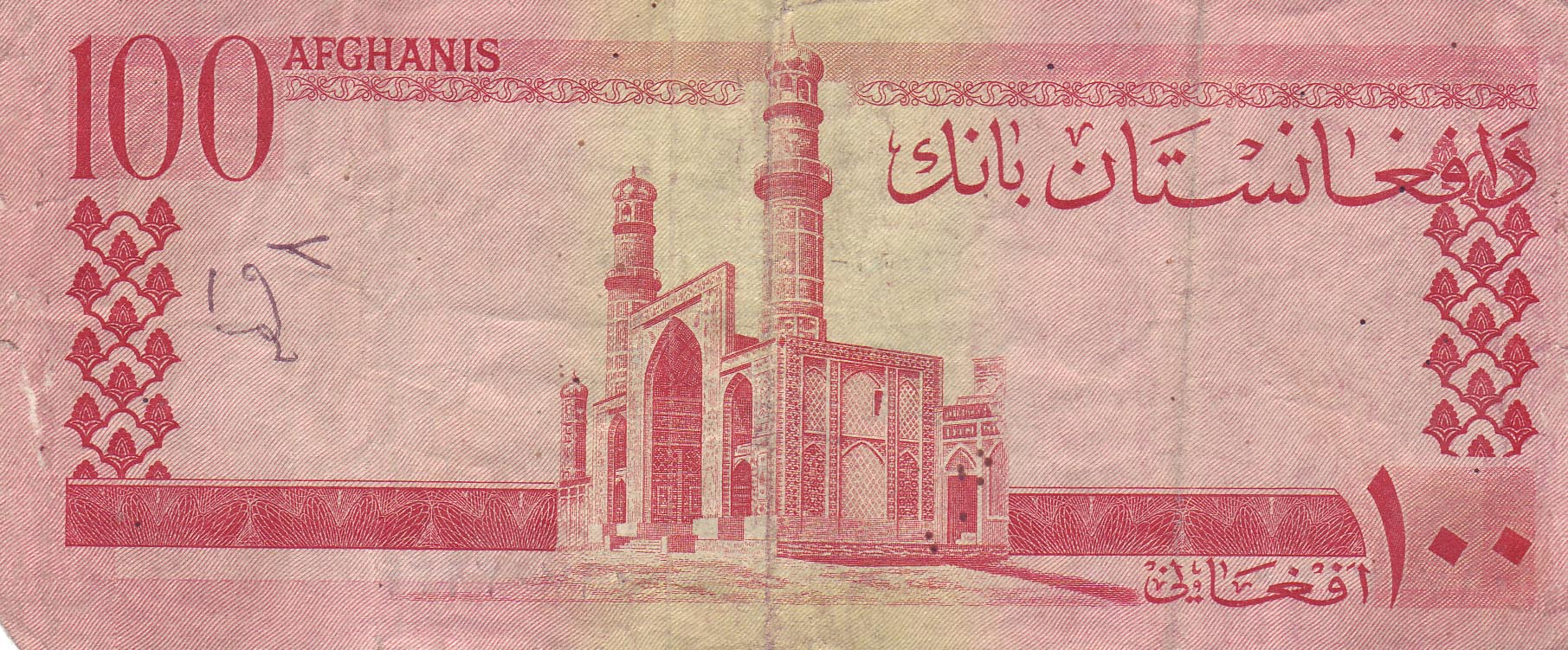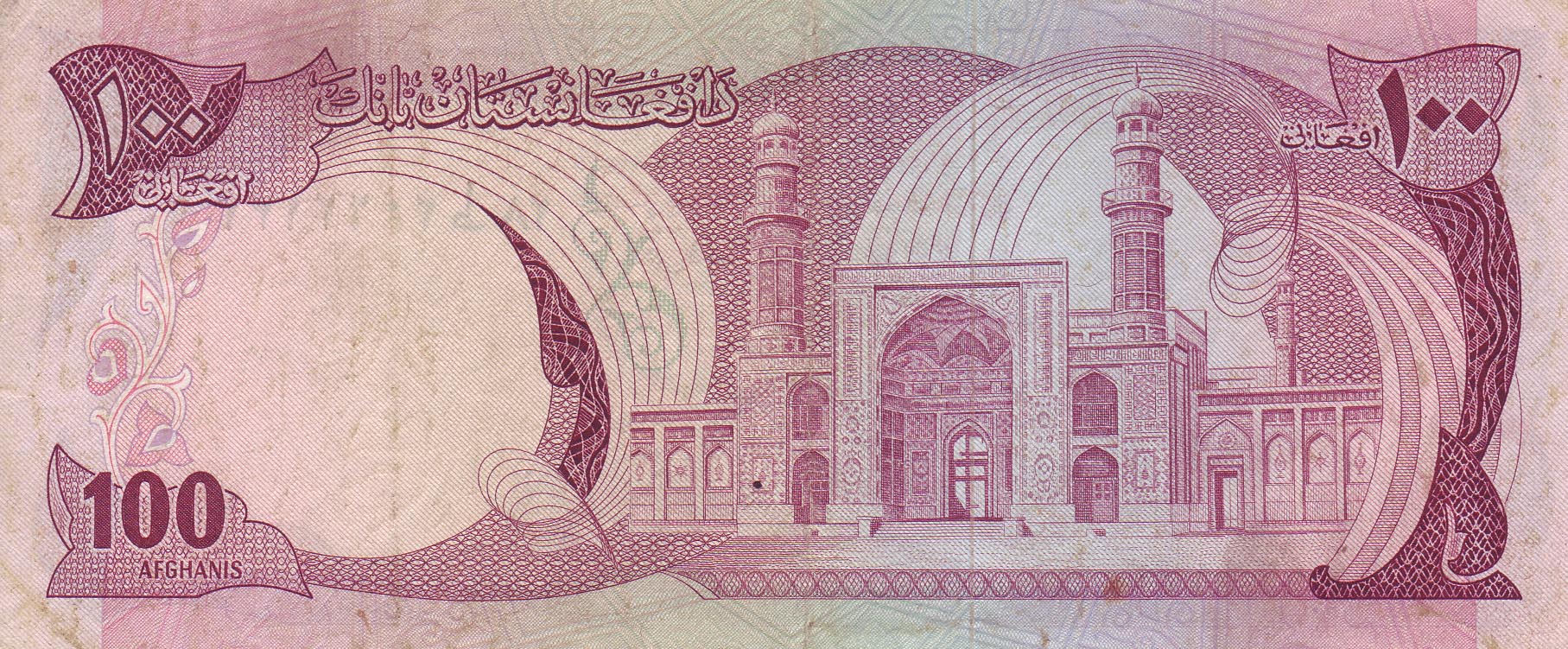 ![]() 100 Afghani (vordere Seite) Motiv: Pul-iKhischti-Moschee, Kabul |