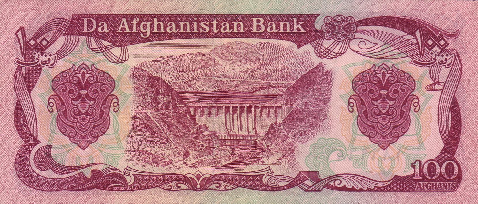 ![]() 100 Afghani (Rückseite) Motiv: Elekrtizitätskraftwerk Naghlu,Jalalabad-Straße |