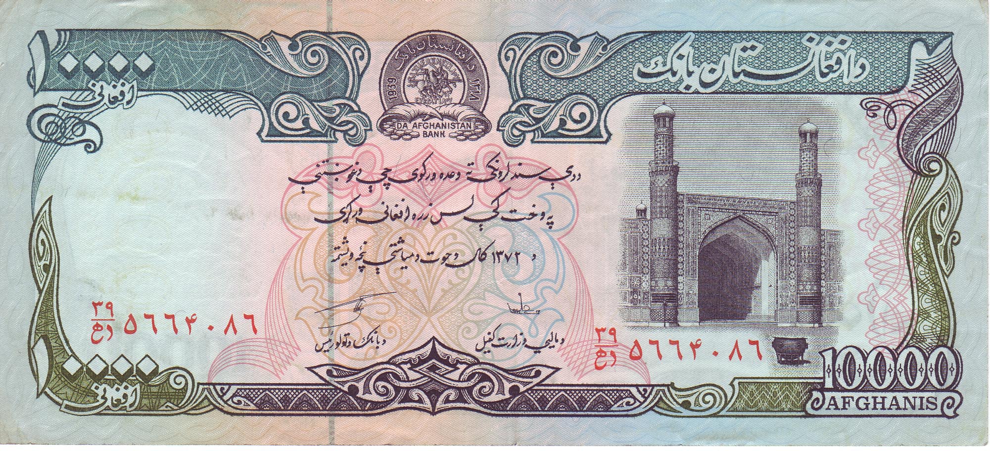 ![]() 10000 Afghani (vordere Seite) Motiv: Historische Moschee, Herat |
