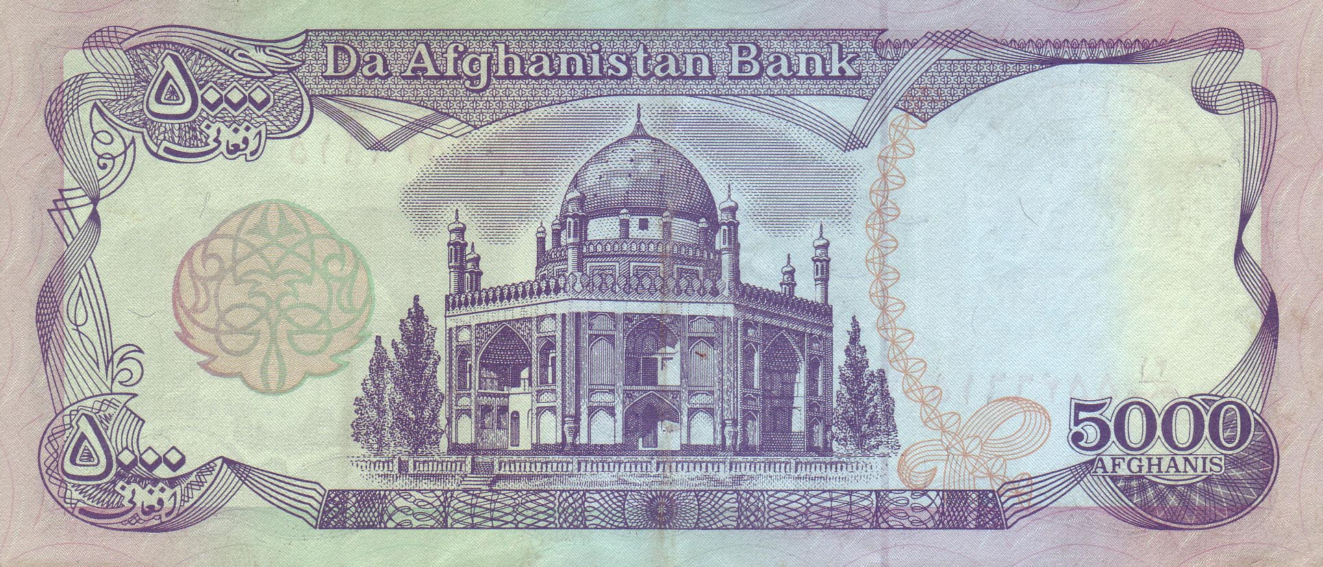 ![]() 5000 Afghani (Rückseiteeite) Motiv: Mir Wais-Mausoleum, Kandahar |