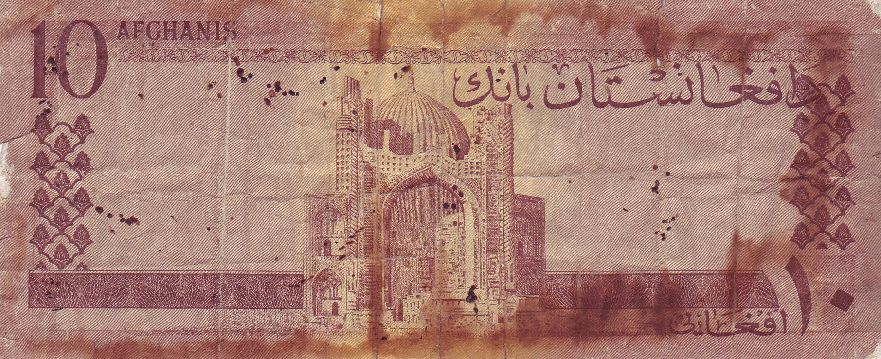 ![]() 10 Afghani (vordere Seite) Motiv: Mir Wais Mausoleum, Kandahar |