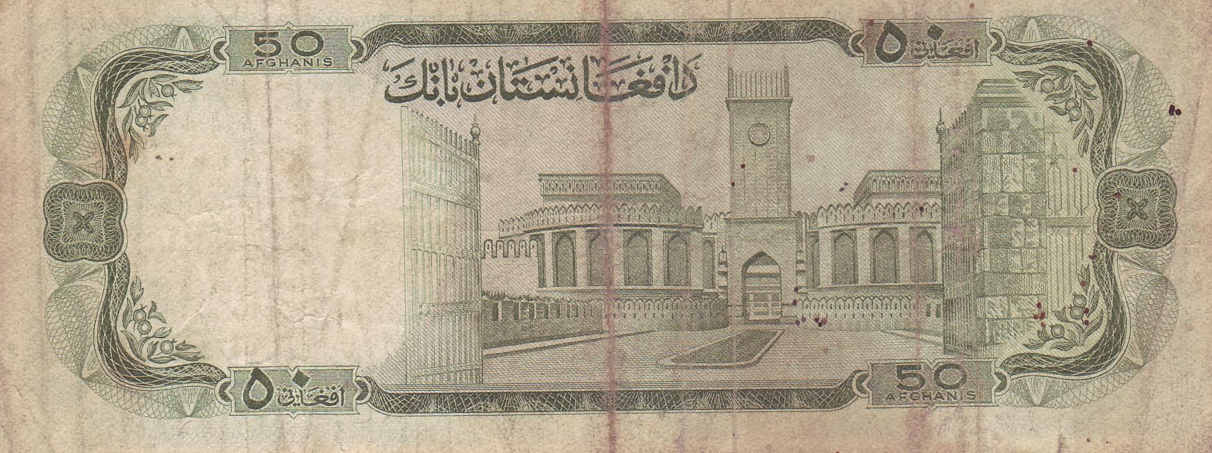 ![]() 50 Afghani (vordere Seite) Motiv: Shah-i-Doshamshera-Moschee, Kabul |